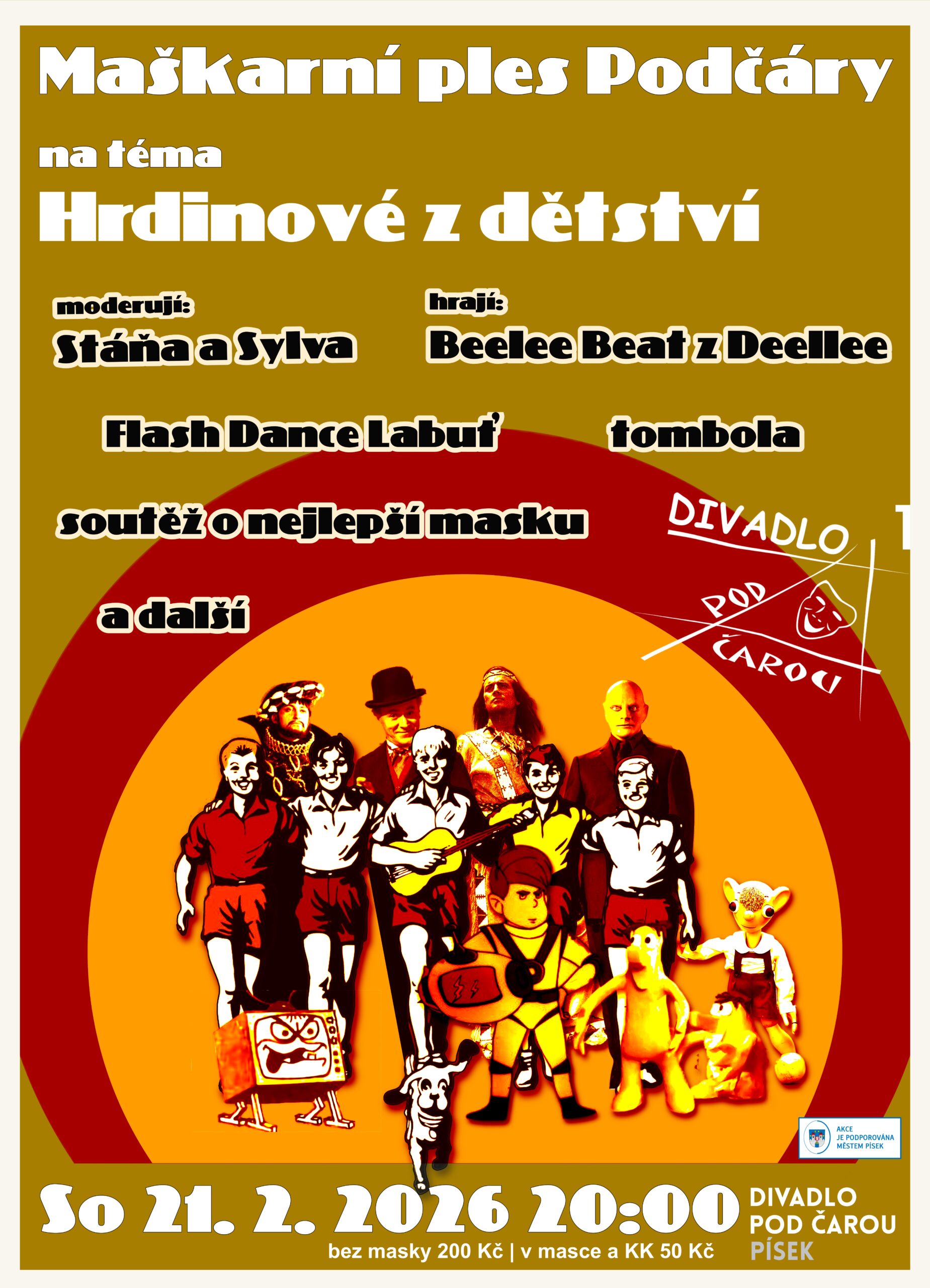 202621únö20:0023:00Ples Divadla Pod čarouna téma: Hrdinové z dětství. Opět po roce tu máme maškarní ples Podčáry s bohatým programem! Zahraje Beelee Beat z Deellee, moderují Sylva a Stáňa ze Studia Dell Arte ČB.20:00 - 23:00 Divadlo Pod čarou, Tyršova 28 Organizátor: Divadlo Pod čarou Kategorie:Připravujeme,Zábava